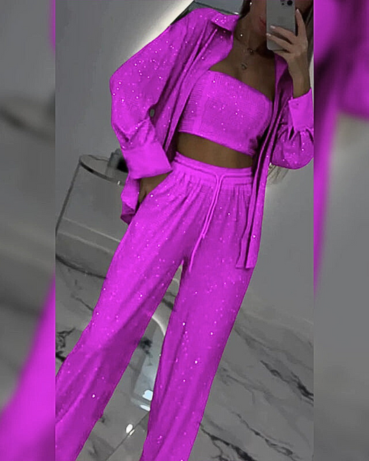 Blazer à paillettes et pantalon large pour femmes (ensemble 3 pièces)